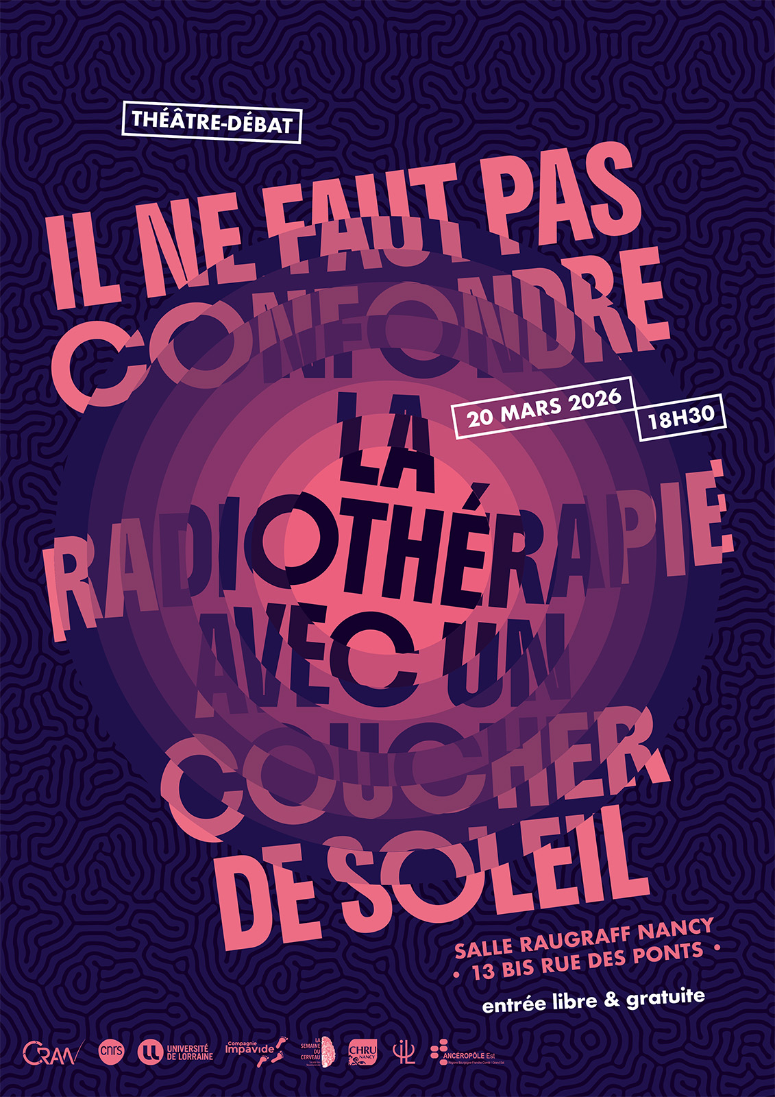 Dans le cadre de la 28ème édition de la semaine du cerveau, le CRAN exposera ses travaux de recherche sur les tumeurs cérébrales au grand public sous la forme d’un théâtre-débat joué par la compagnie Impavide. Venez assister à cette pièce co-écrite par Joël Daouk, ingénieur de recherche au laboratoire et Amélie Aubertin, comédienne et metteuse en scène. La première représentation aura lieu vendredi 20 mars 2026 à 18h30 à la salle Raugraff au 13 bis rue des Ponts à Nancy.